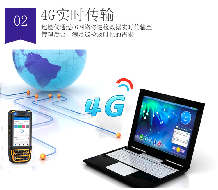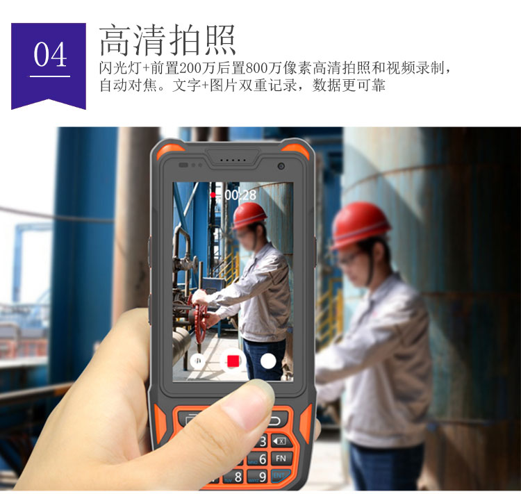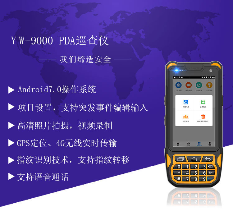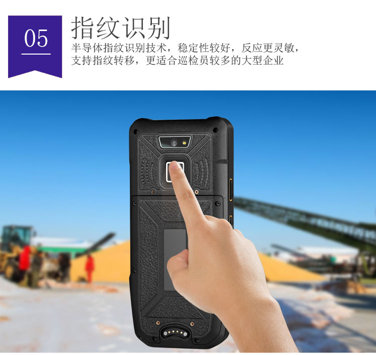 技术参数 外壳结构:工程塑胶外壳,硅胶内胆,超强防水抗摔 屏幕显示:4寸电容式触摸屏,分辨率为800*480 操作系统:Android5.1操作系统,可对接监控、报警平台 CPU:4核 RAM/ROM:2G/16G 外存储量:T-FLASH卡,最大支持32G 防护等级:IP67 指纹识别:半导体指纹识别技术,有效防止代检。系统支持225枚指纹预设(最大1000枚),操作员210枚,管理员15枚。 读卡类型:NFC、ID卡感应读取,二维码扫描读取 线路导航:巡检员可以在巡检仪的“电子地图”板块实时查看自己当前的位置,并根据线路导航提示前往下一个巡检点。 巡检完成率预警:在巡检计划周期结束前一定时间内,巡检完成率达不到预设要求时,后台软件自动报警,管理者可及时通知巡检员进行巡检。 遇险报警:巡检时遇到紧急特殊状况,可一键报警求救 数据采集:每个巡检点下可自定义设置巡检项目(可升级为4级菜单) 项目编辑:巡检员在巡检过程中遇到临时突发情况,可通过项目编辑功能记录备注 通话功能:巡检仪可设置存入10组电话号码,紧急事件可以通过通话功能及时沟通。巡检员只允许对设置好的号码进行呼叫 拍照摄像:前置200万、后置800万像素+闪光灯拍照和视频录制,自动对焦,完美再现巡检现场 照明方式:自带LED照明功能,巡检时无需外带照明设备 实时定位:GPS卫星定位,可在电子地图上实时查看巡检员位置,对巡检员进行实时监管 轨迹回放:可回放、查看指定时间段内巡检员的巡检轨迹,并显示当时巡检信息。 通讯方式:移动/联通/电信4G网络+磁吸式触点USB通讯,高速免驱,运行速度提升达10倍以上 WIFI功能:内置WIFI,可自定义设置WIFI优先或4G网络优先 邮件推送:巡检报表可以以邮件的形式发送给不同的管理者。数据不用电脑也能查看,管理更方便。 远程更新:巡检仪中巡检路线、巡检员及巡检项目信息更新无需连接电脑,可实现远程在线更新 跌摔记录:32000条跌摔记录存储,准确记录机器摔砸时间,减少损坏追责纠纷 支持语言:可支持简体、繁体、英文等多种语言 指令推送:后台管理员可向巡检员实时发送工作指令,实现巡检信息互通,及时解决巡检异常(扩展功能) 外接设备:支持外接测温、测试、测振等设备(扩展功能) 对讲功能:支持网络对讲,可自定义对讲群组,沟通无障碍(扩展功能)
