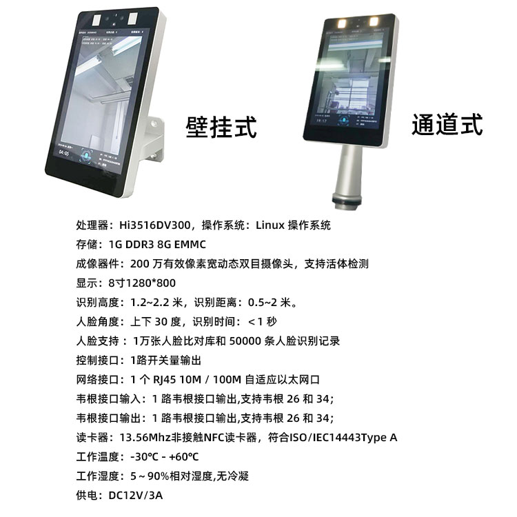 处理器:Hi3516DV300,操作系统:Linux 操作系统 存储:1G DDR3 8G EMMC 成像器件:200 万有效像素宽动态双目摄像头,支持活体检测 显示:8寸1280*800 识别高度:1.2~2.2 米,识别距离:0.5~2 米。 人脸角度:上下 30 度,识别时间:<1 秒 人脸支持 :1万张人脸比对库和 50000 条人脸识别记录 控制接口:1路开关量输出 网络接口:1 个 RJ45 10M / 100M 自适应以太网口 韦根接口输入:1 路韦根接口输出,支持韦根 26 和 34; 韦根接口输出:1 路韦根接口输出,支持韦根 26 和 34; 读卡器:13.56Mhz非接触NFC读卡器,符合ISO/IEC14443Type A 工作温度:-30℃ - +60℃ 工作湿度:5~90%相对湿度,无冷凝 供电:DC12V/3A